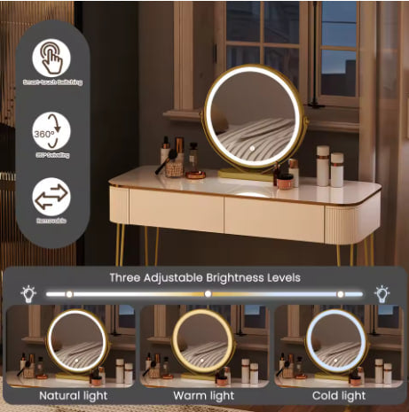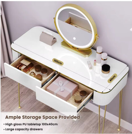 Elegancka biała toaletka z wbudowanym lustrem LED. Oferuje 3-stopniowe regulowane oświetlenie, idealne do precyzyjnego makijażu. Stolik kosmetyczny wyposażony jest w duże szuflady, zapewniające mnóstwo miejsca do przechowywania.